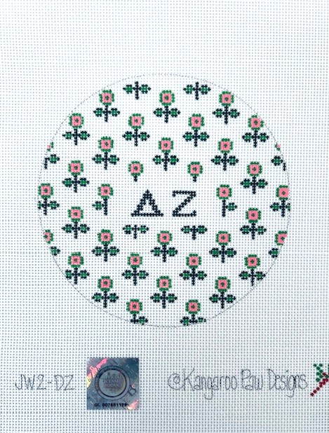 - Adorable large round features sorority letters surrounded by tiny blooms