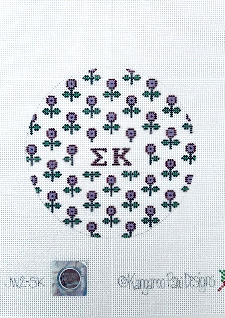 - Adorable round features sorority letters surrounded by tiny blooms