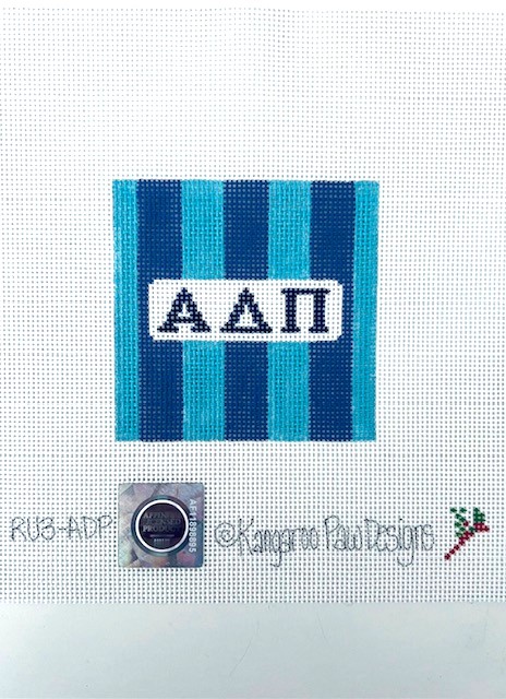 - Inspired by classic rugby shirts with crisp white collars, this 3″ square needlepoint canvas features the group letters set in a field of white, with bold stripes in the sorority colors of shades of blue