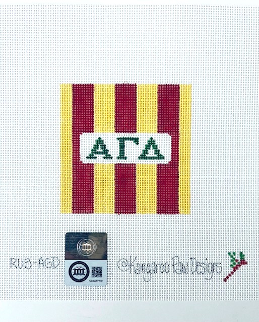 - Inspired by classic rugby shirts with crisp white collars, this 3″ square needlepoint canvas features the group letters in green set in a field of white, with bold stripes in the sorority colors of red and buff