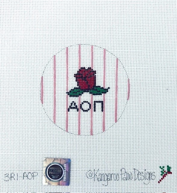 - This 3″ round features the sorority letters and flower, the red rose, on a background of pinstripes-all in the sorority colors of red and pink
