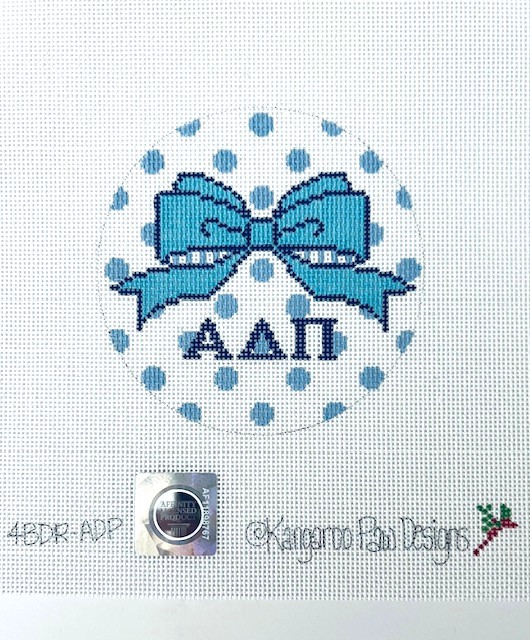 - New for 2025, this 4″ round features an elegant bow poised above the Greek letters set on a background of polka dots, all in the sorority colors of blue and white