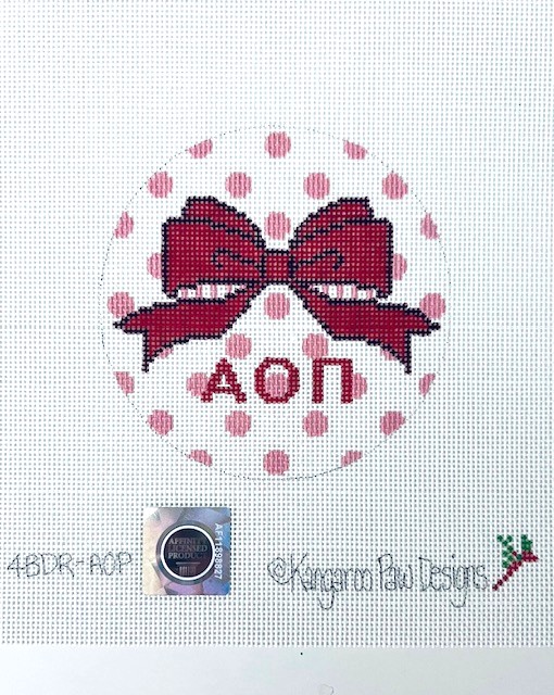 - New for 2025, this 4″ round features an elegant bow poised above the Greek letters set on a background of polka dots, all in the sorority colors of red, pink, and white