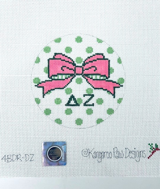 - New for 2025, this 4″ round features an elegant bow poised above the Greek letters on a background of polka dots, all in the sorority colors of pink and green
