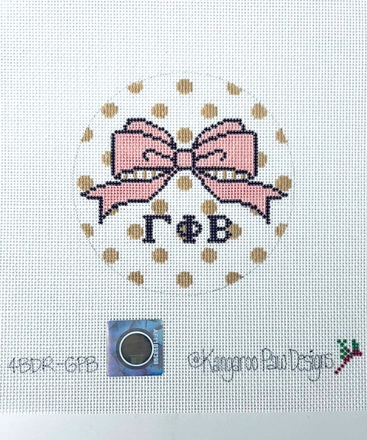 - New for 2025, this 4″ round features an elegant bow poised above the Greek letters on a background of polka dots, all in the sorority colors of brown, mode, and blush
