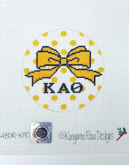 - New for 2025, this 4″ round features an elegant bow poised above the Greek letters on a background of polka dots, all in the sorority colors of black and gold