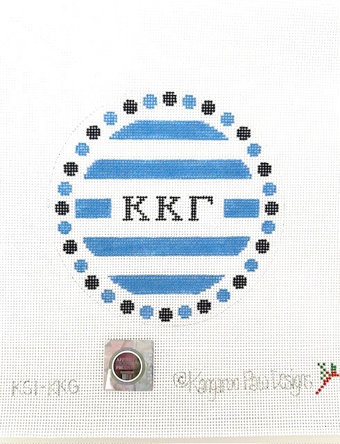 - Bold Horizontal stripes and colorful dots surrounding the Greek letters give a fresh take to the traditional sorority round, all in the sorority colors of light and dark blue