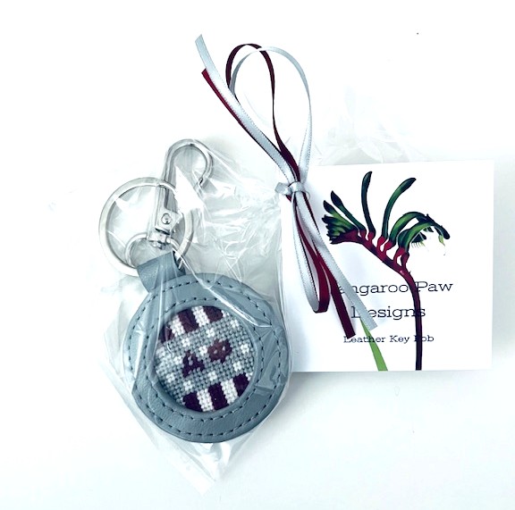- Light Grey leather fob is 2″ round, and features both a split ring and lobster claw clasp. Insert is hand needlepointed in silk and wool, featuring the sorority colors and letters