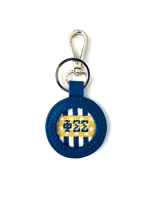 - Royal blue leather key fob is 2″ round, and features both a split ring and lobster claw clasp. Insert is hand needlepointed in silk and wool, featuring the sorority colors and letters