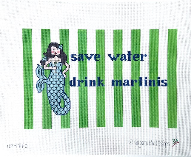 - Our popular Martini mermaid is poised on a field of bright lime green stripes, along with her words of wisdom–Save Water, Drink Martinis– in our signature Kangaroo Paw Designs font in a contrasting hue of bright royal blue